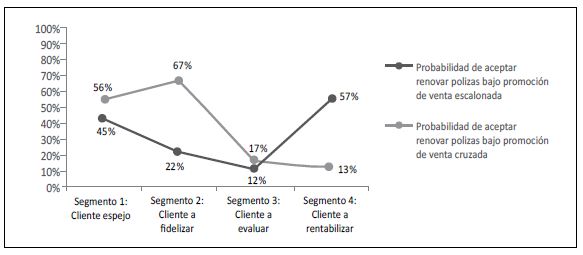El cliente rentable y con alta intención de cambiar de aseguradora (segmento 2) se mostró un 10 % más sensible que los demás tipos de clientes a esquemas promocionales de venta cruzada (X2= 8,109 gl: 3 p=0,017) y este mismo segmento es hasta un 45% más sensible de aceptar la renovación de su póliza en esquemas de venta cruzada que de venta escalonada (U Mann Whitney= 23,500 p= 0,04).