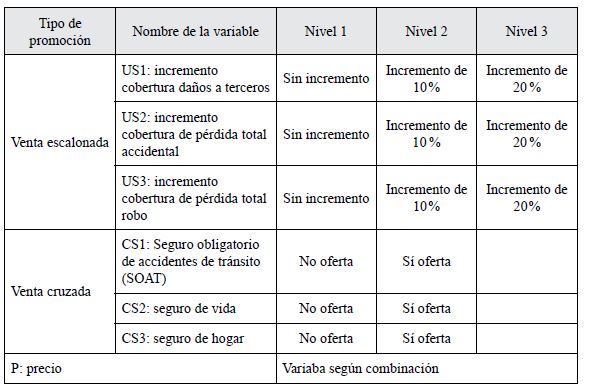 El estudio tiene un diseño cuasiexperimental, solo post, con dos o más tratamientos (Montero & León, 2007) y con una variable independiente cualitativa ordinal —intención de adoptar la promoción— y múltiples variables independientes, que se detallan en la tabla 1.