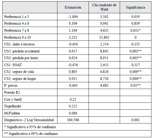 El estadístico chi cuadrado indica que el modelo genera predicciones eficientes sobre el modelo línea base compuesto solo por el intercepto. La variable dependiente que se midió en una escala entre 1 y 10 se dividió en cuatro grupos para facilitar la estimación del intercepto: 1) preferencia de 1 a 3; 2) 4 a 6; 3) 7 a 8, y 4) 9 a 10.