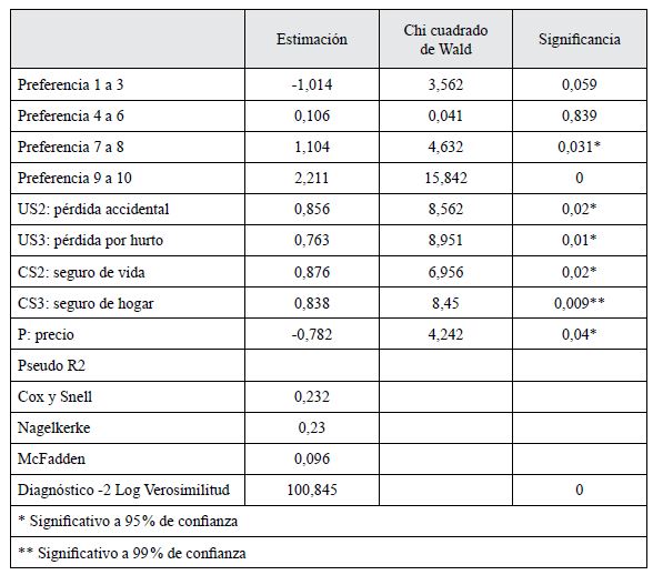 En este modelo se observa el rol relevante del precio sobre la preferencia de una póliza de vehículo, así se encuentre en esquemas promocionales de venta cruzada o de venta escalonada. Esto demuestra que los precios altos tienden a deteriorar la aceptación de una póliza (β=-0,782 p=0,04).