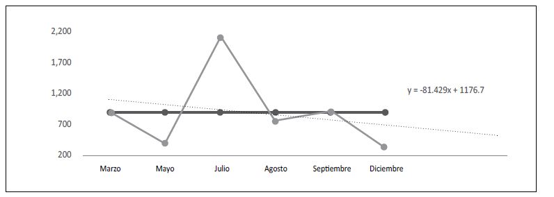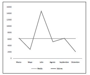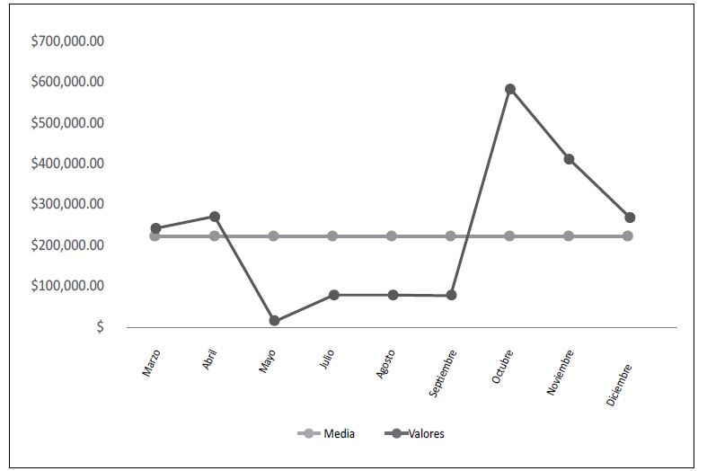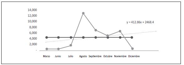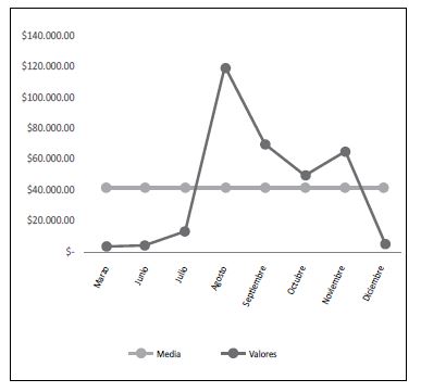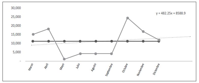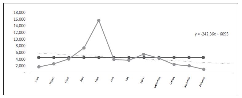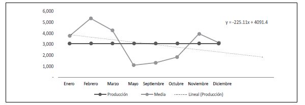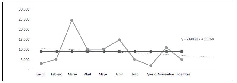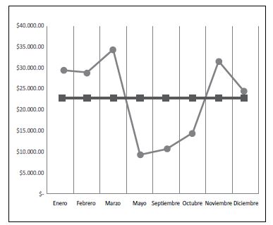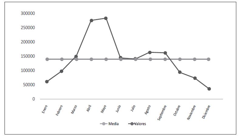 Los resultados en la oficina de Santa Rosalía señalan que un 85% de los meses estuvo por encima de la media. Esto permitió establecer una estimación mensual con un resultado positivo (figura 15).