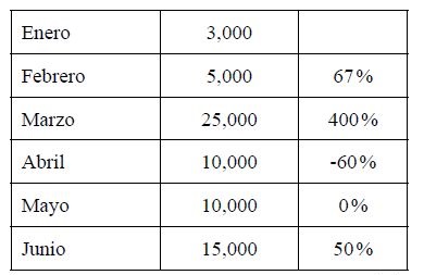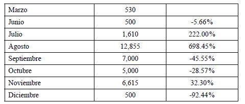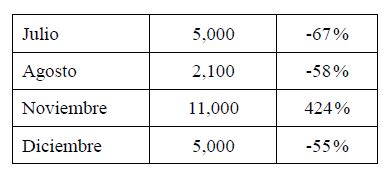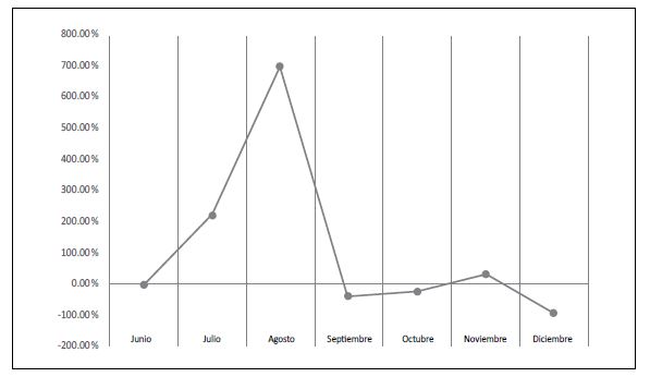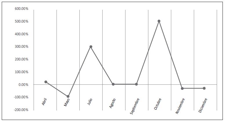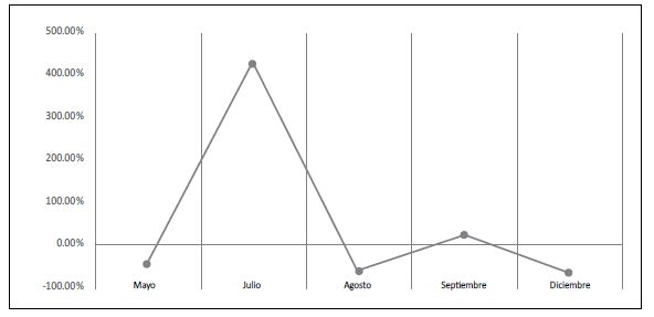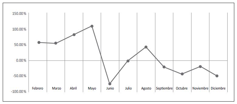 Los resultados del comportamiento de cambio porcentual por mes muestran irregularidad en la producción registrada (tabla 11 y figura 7).