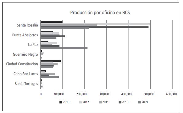 En el comparativo se puede observar que, en la evolución del período 2009-2013, la oficina de Santa Rosalía generó la mitad de la producción del estado de BCS, con una media aproximada de 313.046 toneladas anuales de ostión. Por otra parte, la oficina de Ciudad Constitución reportó solo un 11% de la producción de los últimos cinco años, con una media aproximada de 67.551 toneladas anuales de ostión.