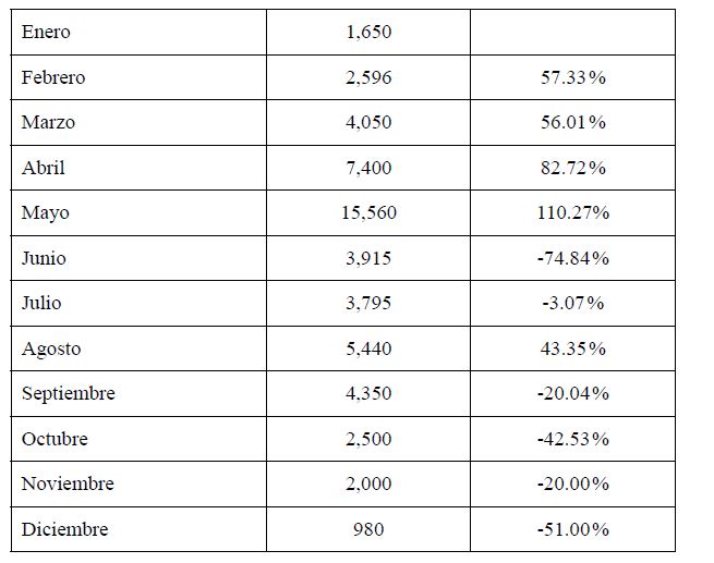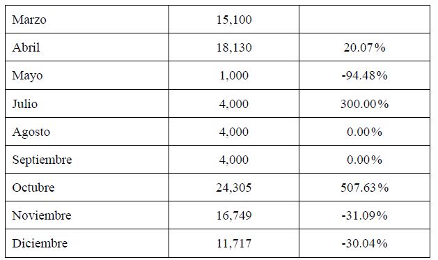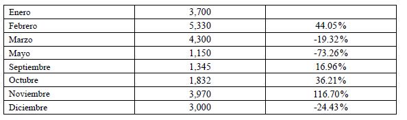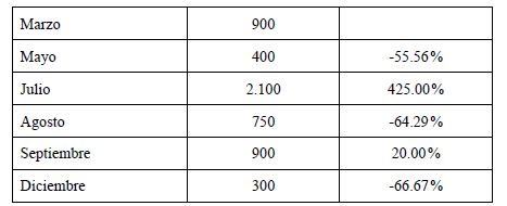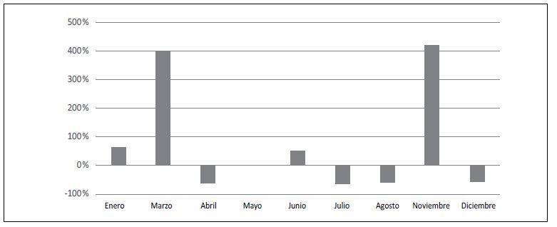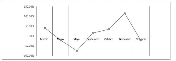 Los resultados en materia del comportamiento de cambio porcentual por mes indican la irregularidad de la producción. Estos se plasman en la tabla 8 y en la figura 5.