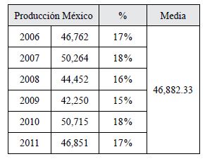 La tabla 1 muestra una repartición casi equitativa de los índices de producción anual mexicana durante el mencionado período. Al obtener un dato promedio es posible visualizar que, durante un 66% del tiempo, la producción de estos moluscos bivalvos estuvo por debajo de la media.
