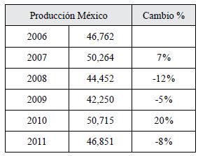El comportamiento de la producción de ostiones en territorio mexicano ha presentado subidas y bajadas, lo que puede interpretarse estadísticamente por medio de indicadores de cambio. Este es el caso que se aprecia en la tabla 2. En ella se observan los comportamientos porcentuales de la producción de ostión en el período 2006-2011. En los años 2008, 2009 y 2011 hubo decrementos en relación con la producción de años anteriores.
