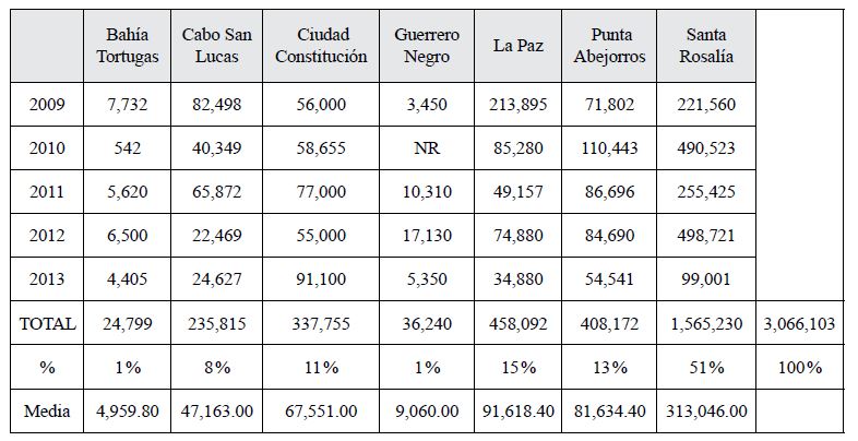 Como se observa en la tabla 12, en 2013, la oficina de Guerrero Negro reportó un total de $37.450. Un 70% de este valor se configuró en los meses de julio a septiembre.