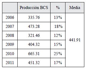 En el escenario estatal, en los últimos años, la producción del estado de BCS ha obtenido los resultados que se incorporan en la tabla 3.