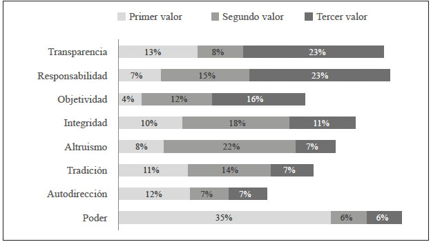 De acuerdo a la revisión de la literatura, inicialmente se examinó la jerarquización de la axiología practicada por los partidos políticos, es decir, los valores fomentados al interior de cada uno de ellos. En la figura 1 se observa que el valor más importante valor fomentado por los partidos políticos es el poder con un 35%; en segundo lugar encontramos al altruismo con un 22%, y en tercer lugar, la trasparencia y la responsabilidad con un 23% cada uno.