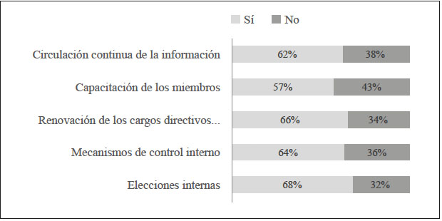 La figura 2 revela los rituales o comportamientos particulares que caracterizan a los partidos políticos, donde el 67,7% declara que sí se desarrollan elecciones internas, el 63,5% revela que si existen mecanismos de control interno, el 65,6% manifiesta que sí se presenta renovación de los cargos dentro de los partidos políticos, el 57% expresa que sí se desarrollan capacitaciones a los miembros o militantes del partido y por último en este apartado de los rituales, el 62% afirma que sí existe dentro de los partidos una circulación continua de la información.