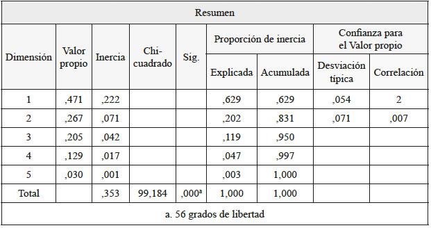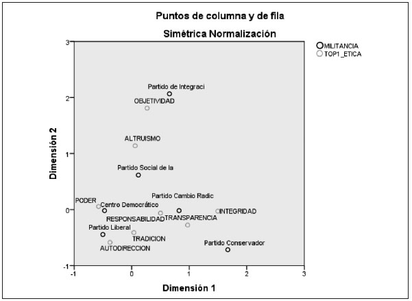 Con el ánimo de profundizar en las relaciones que conforman las comunidades de marca, y con la intención de favorecer una representación visual y estadística de dichas asociaciones, se realizó un análisis de correspondencias simples. Para ello se tomó la militancia, es decir, la representación de cada uno de los partidos políticos con participación en la cuota de la muestra frente al primer valor de la variable “ética de grupo”, es decir, los valores percibidos y fomentados por cada uno de ellos.