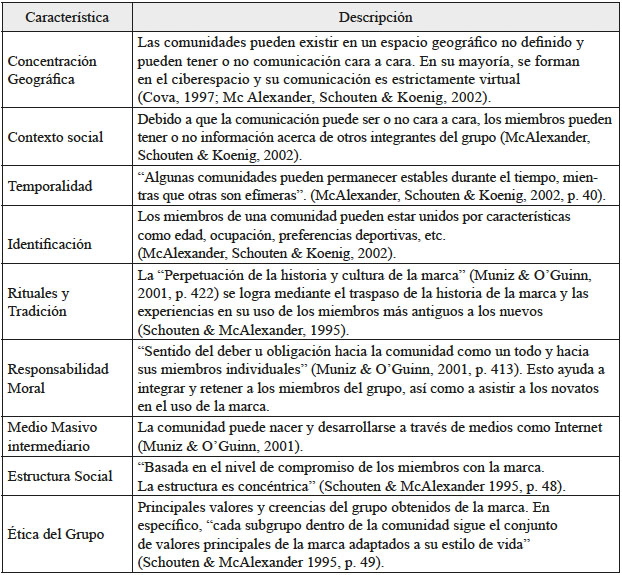 Para Stokburger‐Sauer (2010), las comunidades de marca muestran tres principios tradicionales de comunidad: conciencia compartida, rituales y tradiciones, y un sentido de responsabilidad moral; mientras que Pérez-Chavarría y Rodríguez-Ruiz (2012, p. 179) y relacionan las siguientes características de las comunidades de marca (tabla 1).