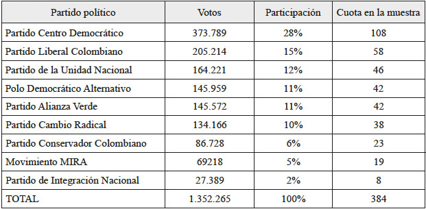 De igual forma, se utilizó un muestreo no probabilístico por cuotas, debido a que no se poseía un marco muestral de unidad de información; cada cuota se definió de acuerdo con la cantidad relativa de militantes de nueve (9) partidos políticos que tuvieron participación en las