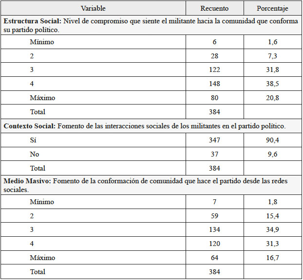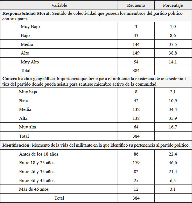 El análisis de las medidas de conformación de grupo en los partidos políticos (tabla 4) muestra que la estructura social, es decir, al nivel de compromiso que siente el militante hacia la comunidad que conforma su partido político. En el presente estudio, el 38,5% dio en este ítem un puntaje de 4, siendo 5 el máximo posible. Por otra parte, el contexto social o el fomento de las interacciones sociales de los militantes en el partido político es positivo para un 90,4% de los encuestados, mientras que el fomento de la conformación de comunidad que hace el partido desde las redes sociales fue calificado por el 34,9% con un puntaje de 3. Frente a la responsabilidad moral, el 38,8% evalúa como alto el sentido de colectividad que poseen los miembros del partido político con sus pares. En cuanto a la concentración geográfica, el 35,9% declara que es alta la importancia que tiene para el militante la existencia de una sede política del partido donde pueda asistir para sentirse miembro activo de la comunidad. Así mismo, el 46,6% de las personas encuestadas plantea que entre los 18 y los 25 años identificaron su pertenencia a los diferentes partidos políticos.