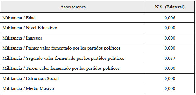 Para profundizar en el análisis estadístico de la caracterización de las comunidades de marca desde las perspectivas del marketing político en la ciudad de Bogotá D.C., se desarrolló un análisis de asociación entre la militancia y variables de caracterización de estas comunidades, por medio de la prueba estadística Chi cuadrado. De esta manera, se identificaron algunas asociaciones las cuales se observan en la tabla 5, obteniendo confirmación de la relación estadística en todas.