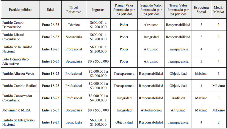 Dadas las anteriores características (ver tabla 5), se percibe un perfil de cada militancia política con variables tanto demográficas, de valores de pertenencia, de estructura social y de percepción de la visibilidad en los medios masivos. Estos hallazgos permiten estimar la existencia de una comunidad de marca por cada uno de los partidos políticos.