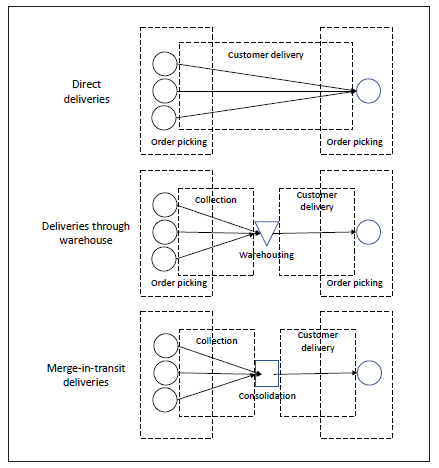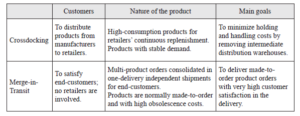 Concerning deliveries through warehouses, there are other distribution strategies also designed to maintain inventory low-levels. One well-known example is ‘crossdocking’. In a typical crossdocking system, goods are moved directly from receiving to shipping through ‘crossdocking centers’; the aim is the elimination of storage and excessive handling (Rohrer, 1995). Like crossdocking, MiT also involves intermediate coordination points called ‘merge-in–transit centers’. Both MiT and crossdocking minimize inventory costs and decrease lead times by avoiding storage time. However, they are applied in different environments (see table 1).