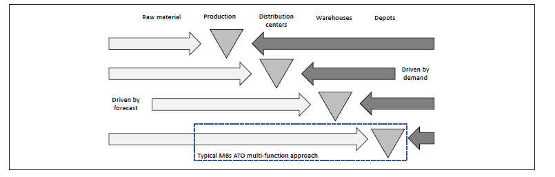 Concerning postponement, this is a traditional strategy followed by MBs. As indicated above, typical MBs follow ATO strategies because these reduce inventories and add flexibility to meet individual customer orders. Postponement concerns moving the decision point for final assembly of a product, what is known as ‘decoupling point’ (see figure 2). The decoupling point indicates inventory decisions related to orders being delayed by intermediaries’ decisions and actions. For instance, at the point of manufacture inventories are usually constituted by components and materials; whereas, at the end of the chain inventories involve finished product (Christopher, 2000).