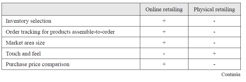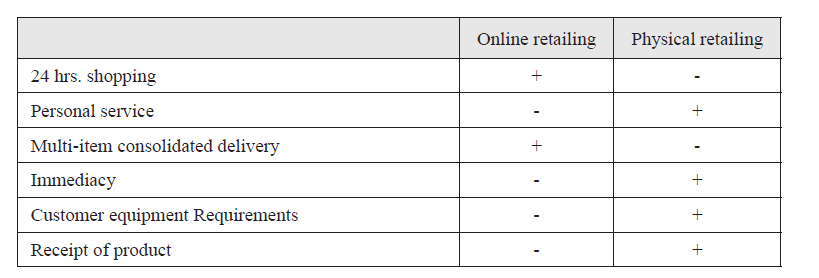 E-commerce and associated IS present benefits and hindrances. Otto and Chung (2000) identify potential advantages and disadvantages in Internet Retailing and traditional Physical Retailing (see table 3).