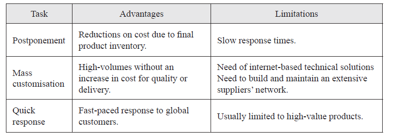 A summary of advantages and limitations of postponement, mass customization and quick response is presented in table 5.