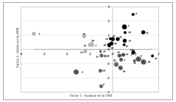 A partir de lo anterior, surgen tres tipologías de PEDA en cuanto a su OME, cuya dispersión según los datos asociados a los factores 1) Audacia en la OME y 2) Orden en la OME pueden observarse en la figura 2.