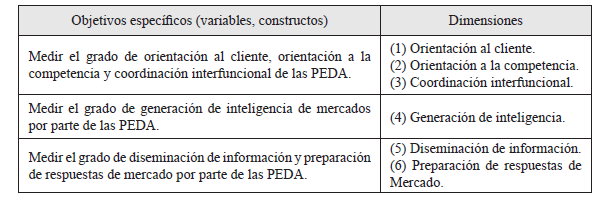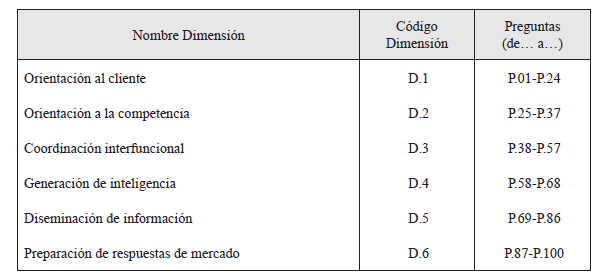 Mediante un cuestionario se indagó por las variables en estudio y fue aplicado a las personas encargadas de las actividades de comercio exterior o a los gerentes generales de las empresas participantes. El diseño del cuestionario fue el resultado de un proceso de adaptación y ajuste al contexto y lenguaje propios del estudio, de las propuestas de Narver Slater (1990), Jaworski y Kohli (1993), Cadogan y Diamantopoulos (1995) y Cadogan, Diamantopoulos y Pahud de Mortanges (1999). El cuestionario final resultó en 66 afirmaciones en escalamiento tipo Likert, sobre seis dimensiones tendientes a solucionar los tres objetivos específicos (tabla 1).