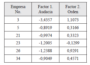 El primer grupo, denominado empresas tímidas (conglomerado 3, color amarillo), está conformado por seis organizaciones caracterizadas como muy poco audaces y moderadamente ordenadas en su OME. Esto se ve reflejado en sus puntuaciones: baja en el factor 1 y media en el factor 2 (figura 2 y tabla 9).