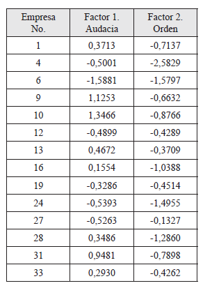 Finalmente, el tercer grupo, denominado como empresas encaminadas (conglomerado 2, color azul), está conformado por quince organizaciones caracterizadas como relativamente audaces y ordenadas en su OME. Esto se ve reflejado en sus puntuaciones medias y altas en ambos factores 1 y 2 (figura 2 y tabla 11).
