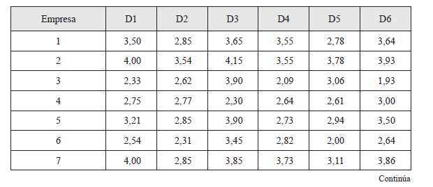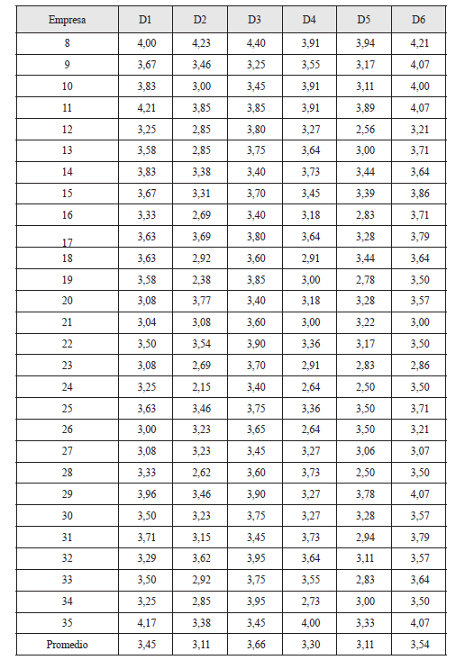 En este punto, fueron asignados valores numéricos a las respuestas existentes que venían en escala Likert, así: muy de acuerdo (valor: 5); de acuerdo (valor: 4); ni de acuerdo ni en desacuerdo (valor: 3); en desacuerdo (valor: 2); muy en desacuerdo (valor: 1). Estos valores permitieron establecer una tendencia en cuanto al grado de OME de las empresas participantes, en las diferentes dimensiones, esto quiere decir que una empresa con un alto grado de OME tendrá valores más elevados (tendientes a 5), que una empresa con un bajo grado de OME, que tendrá valores bajos (tendientes a 1). En esta sección, se tomaron los promedios de cada una de las seis dimensiones.