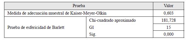 Inicialmente, para verificar la viabilidad del ACP se aplicaron dos pruebas: 1) la prueba de esfericidad de Barlett y 2) la prueba de Kaiser-Meyer-Olkin (KMO). La primera permite contrastar la hipótesis de que la matriz de correlaciones es una matriz de identidad y el objetivo es rechazarla verificándose la correlación existente entre las variables analizadas. Por su parte, la KMO mide la idoneidad de los datos a analizar y debe corresponder a un valor preferiblemente superior a 0,6. En este caso se obtuvo un dato KMO de 0,603 que, si bien indica un nivel mediano, es suficiente para conseguir los resultados deseados (tabla 4), haciendo procedente el ACP propuesto. En adición, se obtuvo en la prueba de esfericidad de Bartlett –que evalúa la aplicabilidad del análisis factorial de las variables estudiadas– un p-valor de 0,000, con lo cual puede afirmarse que el modelo es significativo (aceptamos la hipótesis nula, H0) cuando se puede aplicar el análisis factorial, así: