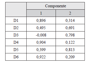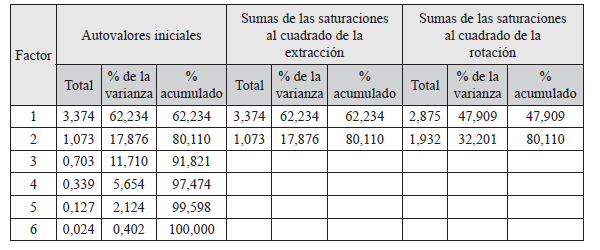 En la tabla 5 se observan las dimensiones que más aportan a la varianza total. A pesar de que estos factores o componentes presentaron valores propios mayores a uno (1), se utiliza el criterio del porcentaje para elegir los dos primeros factores, porque representan en su conjunto poco más del 80% de la varianza total, mientras que el aporte de los componentes restantes se estabiliza a partir del tercero, el cual solo explica un 11,7%. Así, a partir de ese punto, las contribuciones son marginales (Cuadras, 2014).
