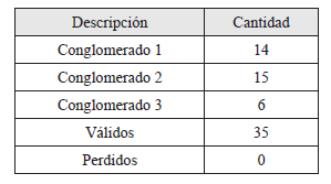 En este punto se desarrolló un Análisis de clúster o de conglomerado, utilizando los dos factores identificados previamente en el ACP: 1) audacia en la OME y 2) orden en la OME. Así, el objetivo de esta etapa del análisis, a partir de estos factores y las 35 PEDAS participantes, consistió en identificar grupos cuyas semejanzas permitiesen clasificarlos por su grado de homogeneidad o distinguirlos por sus marcadas diferencias. Esta organización de los datos parte de la premisa de que son heterogéneos y se desea dividirlos en un número predeterminado de grupos, de tal manera que, como lo indica Peña (2002), cada elemento quede clasificado y pertenezca a uno solo de los grupos y que cada grupo sea internamente homogéneo. En este sentido, la tabla 7 muestra el conteo de los casos para cada conglomerado, resaltando aquí el cumplimiento de estos criterios, es decir, que todos y cada uno de los casos lograsen ser clasificados en alguno de los tres conglomerados resultantes.