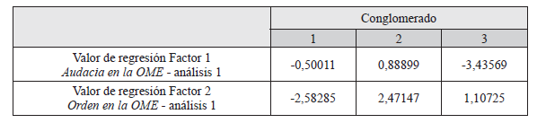 La tabla 8 indica que el primer conglomerado de PEDA está especialmente explicado por altas valoraciones en el factor uno (Audacia en la OME). El segundo conglomerado de empresas esta explicado principalmente por mejores puntuaciones en ambos factores (Audacia en la OME y Orden en la OME). Finalmente, el tercer grupo se explica principalmente por altas valoraciones del segundo factor (Orden en la OME).