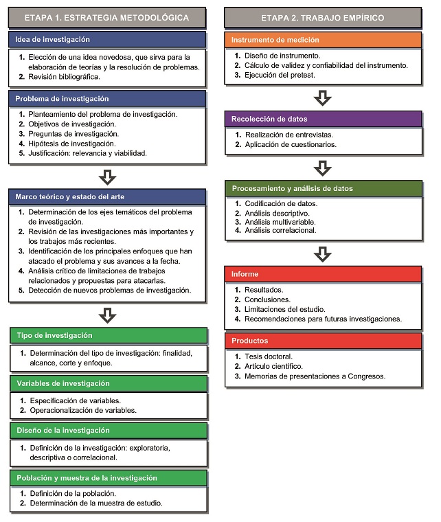 En la etapa de establecimiento de la estrategia metodológica, se concibe la idea de la investigación y se realiza la revisión de la literatura para delimitar el contexto del problema y plantear la situación problemática, las preguntas, los objetivos, la hipótesis y la justificación de la investigación. Después, se desarrolla el marco teórico y se establece el estado del arte, para continuar con la determinación del tipo de investigación en cuanto a su finalidad, alcance, corte y enfoque.