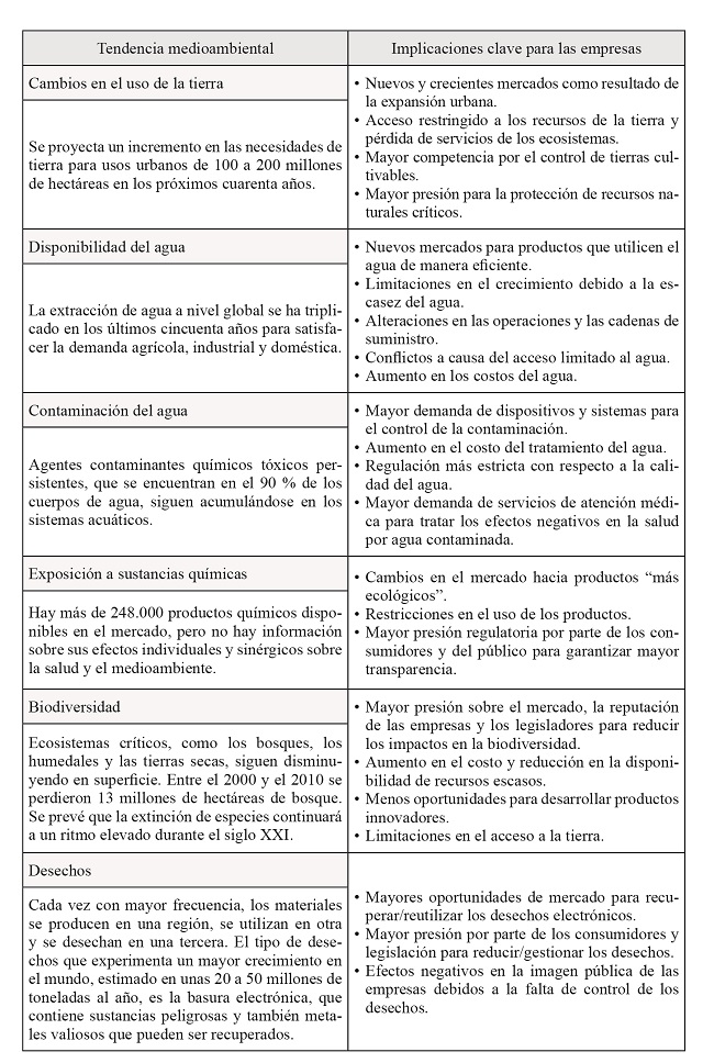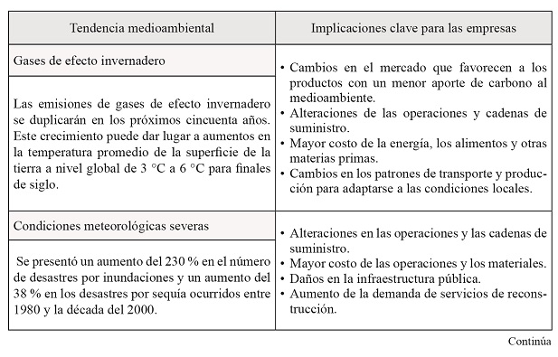 Las actuales tendencias medioambientales globales, como los gases de efecto invernadero, clima extremo, la disponibilidad de agua, la pérdida de biodiversidad y el manejo de desechos, entre otras, están generando nuevas amenazas, pero, a su vez, nuevas oportunidades para las empresas en todas las industrias. La transición hacia una economía más ecológica creará grandes oportunidades para las compañías que entiendan las implicaciones de estas tendencias y que las tomen en cuenta en su planificación y en su estrategia de negocios. Por el contrario, las empresas que no logren entender los cambios o que actúen con demasiada lentitud pondrán su valor en riesgo (UNEP, 2013). En la tabla 1 se muestran las principales tendencias medioambientales en la actualidad, así como las implicaciones clave para las empresas.