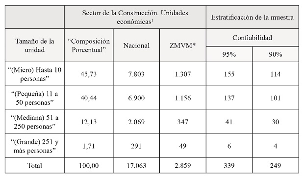 En cuanto al número de unidades económicas del Sector de la Construcción, correspondientes al espacio geográfico de la Zona Metropolitana del Valle de México (ZMVM), están conformadas por 33 localidades que pertenecen a las 16 delegaciones de la Ciudad de México; siete localidades del municipio Tizayuca, del estado de Hidalgo, y 227 localidades de 59 de los 125 municipios del estado de México (SEDESOL, CONAPO & INEGI, 2012; INEGI, 2016a); al no disponer de datos agrupados a nivel Zona Metropolitana, ni segmentados a nivel delegación y municipio, se emplean los valores obtenidos para el total de las unidades económicas del sector de la Construcción, ubicadas en la Ciudad de México (1617), el estado de México (913) y el estado de Hidalgo (329), apreciando que su suma integra satisfactoriamente las unidades económicas localizadas en la ZMVM (INEGI, 2016d). La estratificación de la muestra, según lo expuesto, se presenta en la tabla 3.