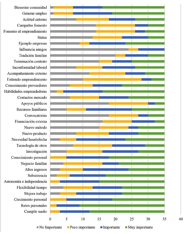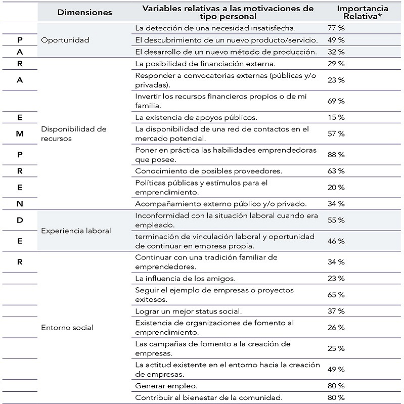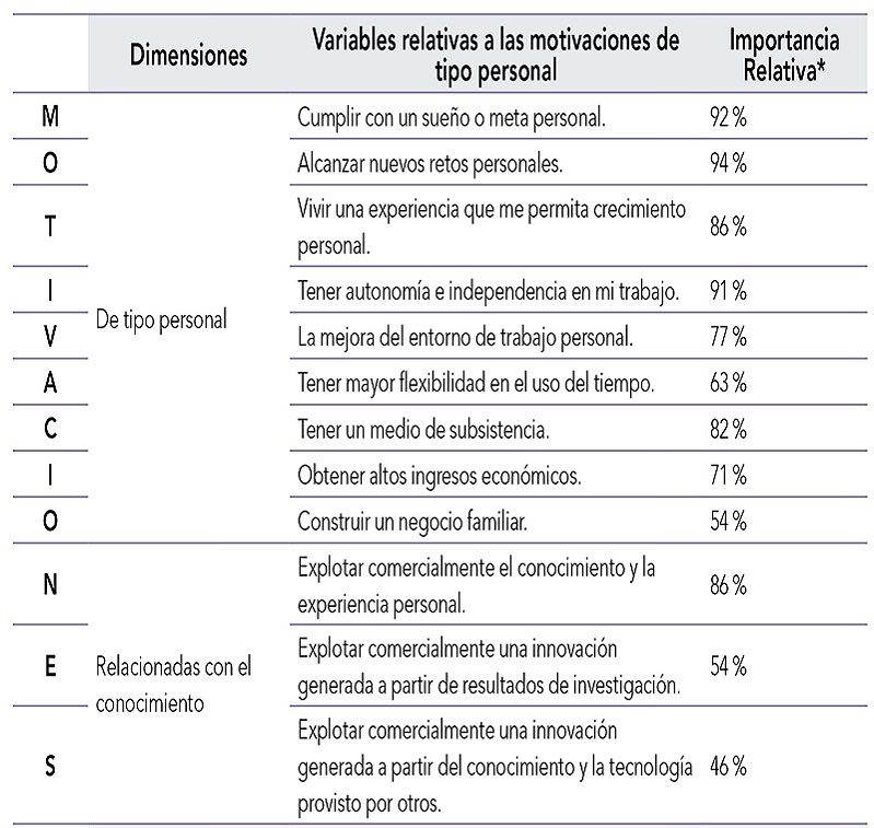 De tipo personal: Las motivaciones que tuvieron una importancia relativa superior al 90 % (suma de respuestas “importante” y “muy importante”) son “cumplir con un sueño o meta personal”, “alcanzar nuevos retos personales” y “autonomía e independencia en el trabajo”. El aspecto económico, aunque es importante, no es lo primordial, el factor “Tener un medio de subsistencia” fue el más influyente.