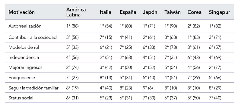 Precisamente, esta investigación se originó en el deseo de contribuir al reconocimiento de la importancia del individuo en el proceso del emprendimiento, enfocándose en el estudio de las motivaciones, por ser el primer paso en dicho proceso. Aunque se han realizado diversas investigaciones tendientes a encontrar las motivaciones de los emprendedores en diferentes países del mundo, los resultados de éstas no son universales, pues la cultura en la cual nos desarrollamos ejerce una gran influencia en todos los aspectos humanos (Hofstede, 1983; Shane et al., 2003), Circunstancia que puede verificarse con los resultados obtenidos por Kantis, Angelelli y Moori (2004) (tabla 1) en su investigación desarrollada para encontrar las motivaciones de los emprendedores en 13 países de América Latina, el este de Asia y el sur de Europa. A partir de dichos resultados, los autores plantean que las diferencias presentadas indicarían la existencia de contextos culturales muy diferenciados. Es así, que se hace necesario realizar un estudio que permita identificar las motivaciones que llevan a las personas del Valle de Aburrá a convertirse en emprendedoras, lo cual, además de contribuir con la teoría sobre el emprendimiento, servirá de base a las entidades y programas de fomento a esta actividad, para dirigir los esfuerzos y recursos hacia aquellos que tengan mayores posibilidades de crear y gestionar la empresa para que ésta permanezca.