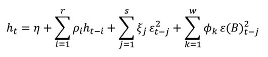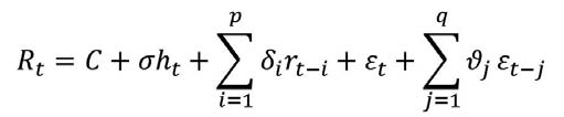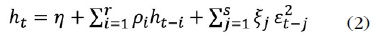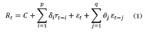 The above equation represents the ARMA (p, q) process, and the conditional variance (ht) for the above equation is represented as: