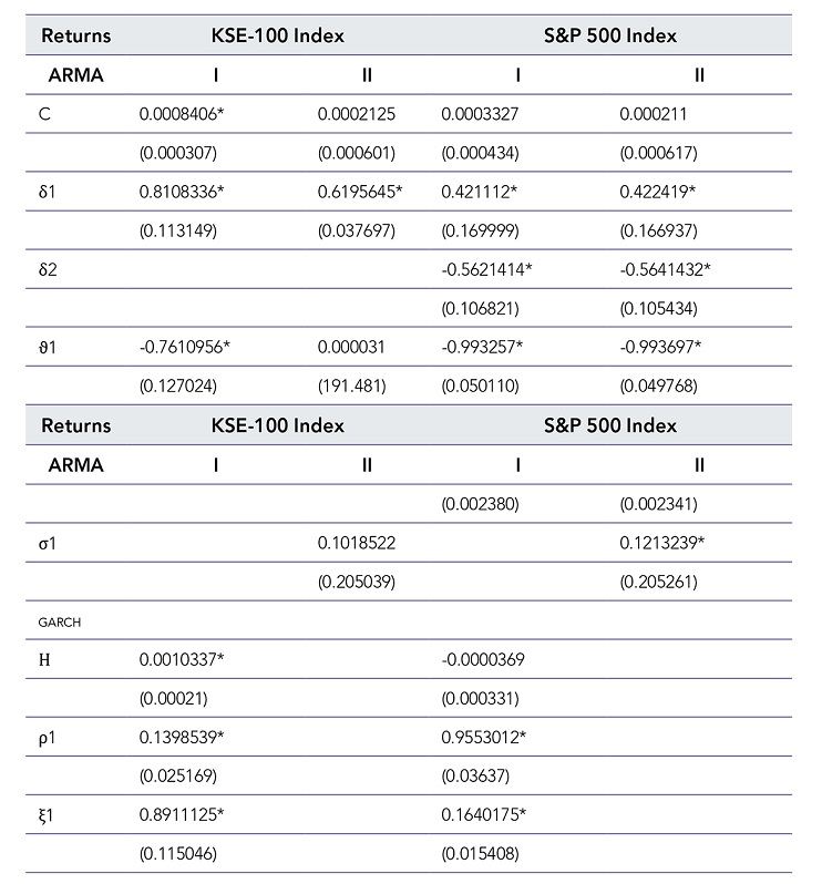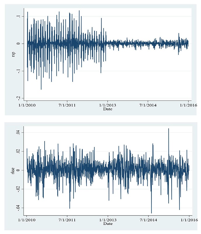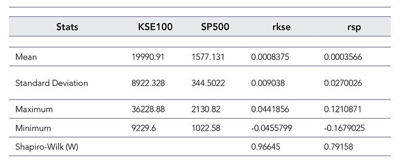 The econometric package STATA 12.0 is used for applying the garch modeling on the data sets. The data used is thedaily closing index prices of the S&P500 and KSE100 indexes acquired from Yahoo Finance. The sample period is from January 1, 2010 to December 31, 2015, with a total of 1488 observations for both markets.The daily returns were evaluated as the change in natural log of closing prices of succeeding days: