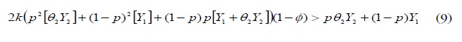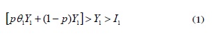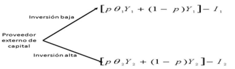 θ2> θ1 > 1 son los factores de incremento de los valores presentes de los flujos de caja si el estado de la naturaleza es bueno y se hace la inversión baja o alta, respectivamente. Este supuesto implica que así como cuando las cosas no funcionan bien, las perdidas pueden ser mayores en la medida que se invierte más (por eso Y2 <I2, en el estado malo de la naturaleza), también cuando las cosas salen bien los retornos pueden ser superiores si hace una inversión alta (por eso θ2> θ1 ).