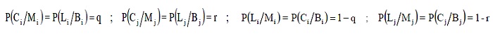 El trabajo del gerente corporativo es evaluar el merito de cada unidad de negocio parainvertir en ella, inicialmente con base en la solicitud del gerente de la unidad de negocio.Sin embargo, como ya se ha dicho, el gerente de la unidad de negocio tiene tendencia aquerer dominar la mayor cantidad de recursos posibles, por ello el gerente corporativo,además de escuchar la solicitud, se basa en un conjunto de información que conformauna creencia acerca de si el estado de la naturaleza le es o no favorable a una determinadaunidad de negocio. Así, si suponemos que existen dos unidades de negocio ( i, j ) en unacorporación, el gerente corporativo acierta cuando hace una inversión alta ( L = I2 ) enuna unidad de negocio que enfrentará un estado bueno de la naturaleza ( B ) o cuandohace una inversión baja ( C = I1) en una unidad de negocio que enfrenta un estado malo (M) de la naturaleza; esta probabilidad de acierto la denotaremos como q , y puedeexpresarse de la siguiente manera: