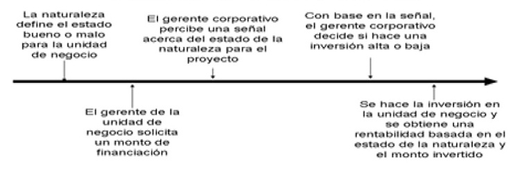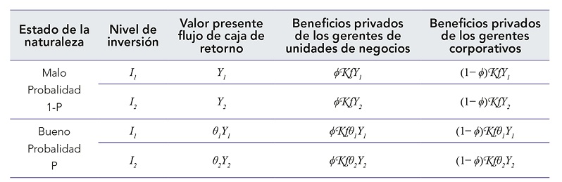 El gerente de la nueva unidad estratégica de negocio observa directamente el estado de la naturaleza, pero el gerente corporativo, los inversionistas y los proveedores de financiación, no. Los proveedores de financiación y los inversionistas solo estarían de acuerdo con realizar una inversión acorde con el estado de la naturaleza; sin embargo, los gerentes corporativos y los de las unidades de negocios tienen la tendencia de realizar reportes con sobreestimación de los posibles resultados de la inversión, debido a que ellos derivan beneficios privados por el incremento de los recursos bajo su control. El parámetro f <1 se utiliza para indicar la porción de los valores presentes de los flujos de caja que gerentes corporativos obtienen como beneficio privado.