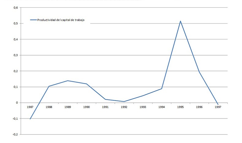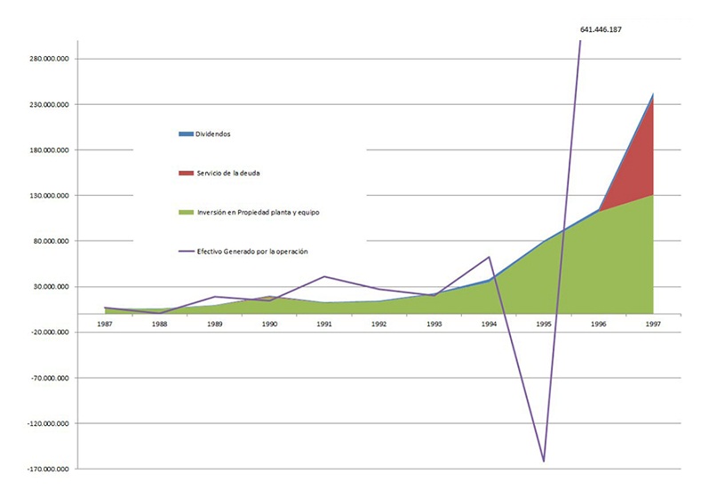 Si analizamos un período de 10 años antes del Spin-off (1987-1997) se denota que en algunos años Bavaria trabajaba con capital de trabajo negativo (1987 y 1997) y en los años 19991 a 1994, requirió menos de 9 centavos de capital de trabajo por peso vendido. La liquidez de Bavaria puede corroborarse en el gráfica 2, se muestra una comparación entre el efectivo generado por la operación y el acumulado de sus destinaciones (Servicio de la deuda, dividendos e inversiones en propiedad planta y equipo). Como puede notarse, excepto para el año 1995, el efectivo generado por la operación supera ampliamente las destinaciones, lo cual establece la posibilidad de generación del mercado interno de capital.