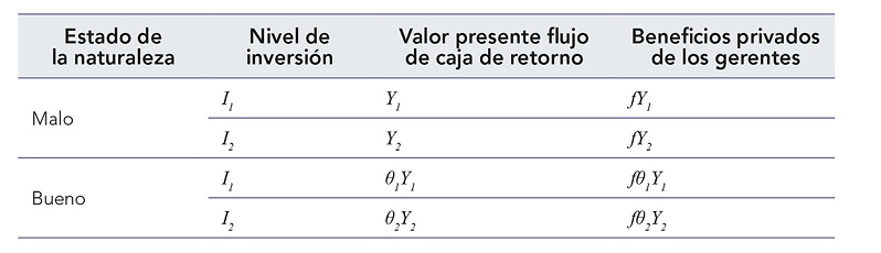 Para modelar esta tendencia a la sobreestimación de la gerencia, suponemos que los beneficios privados (no observables) de los gerentes son proporcionales al monto de los flujos de caja resultantes de las inversiones realizadas. El beneficio privado del gerente se puede calcular como el producto entre el flujo de caja obtenido en cada estado de la naturaleza, dependiendo del monto de la inversión realizada, por el parámetro f.