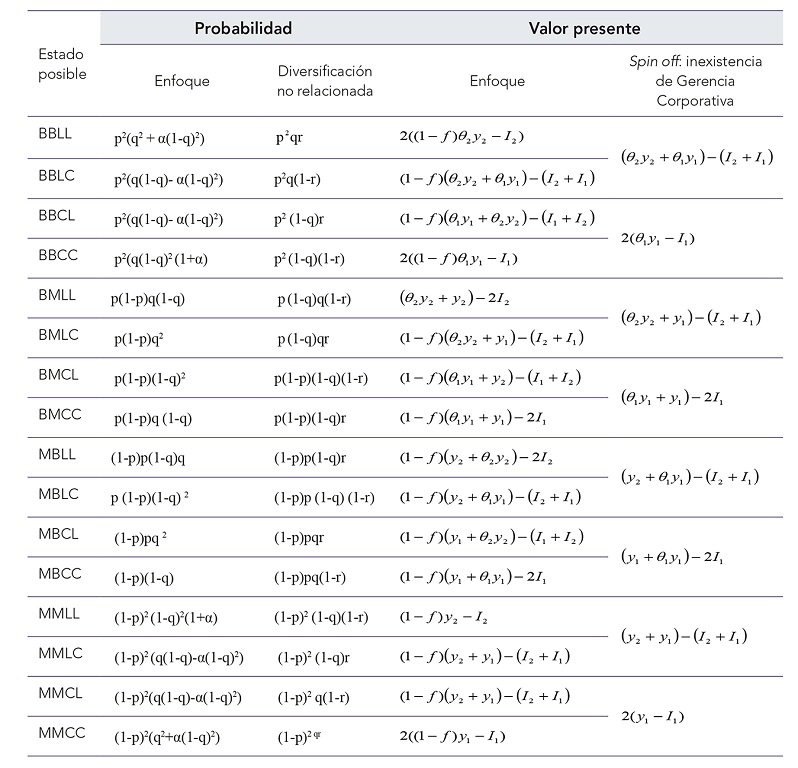 Por no ser relevante para el análisis de esta parte, omitiremos los factores φ y k . El factor f del beneficio privado de los gerentes corporativos sí es relevante, debido a que si sehace un spin off este factor desaparece. Tal como lo realizó Stein (1997), se utiliza la reglade Bayes para calcular las probabilidades y el valor presente de la inversión para cadaposible situación, dependiendo de si se trata de una corporación con diversificación ocon enfoque. Los resultados se muestran en la tabla 4.