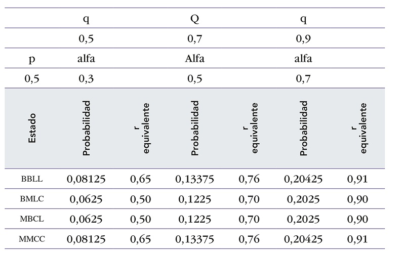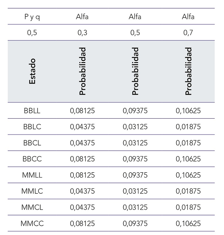 La combinación BBLL puede entenderse como el caso en que el estado de la naturalezafue bueno para ambas unidades de negocio y el gerente tomo la decisión de hacer unainversión alta en ambas. La combinación BMLC representa el caso en el cual el estado de lanaturaleza fue bueno para la unidad i y malo para la unidad j ; el gerente tomó la decisiónde hacer una inversión alta en la unidad i y baja en la unidad j .Un ejemplo numéricodel resultado anterior se presenta en la tabla 5, en donde se calculan las probabilidadesque varían por la inclusión del parámetro α :