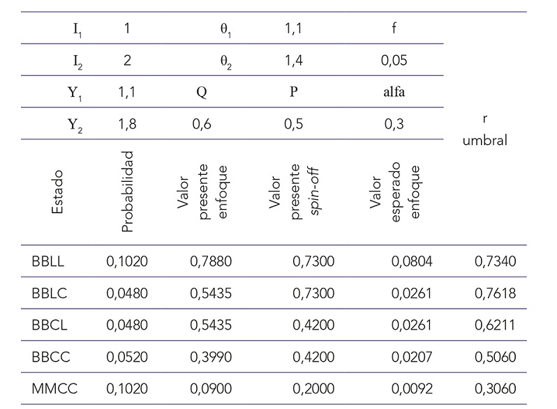 El retorno mínimo requerido por un inversionista es Ri = 1 + ri (uno más la tasa de retorno mínina requerida por el inversionista) y Rcel retorno requerido por la corporación para que una unidad de negocio incremente la rentabilidad total de la corporación (Rc > 1 + rc:el retorno requerido debe ser mayor a uno más la tasa de retorno actual de la corporación). La corporación puede invertir I1 (inversión baja) o I2 (inversión alta; 2I1 = I2). El retorno de la inversión depende del estado de la naturaleza que puede ser bueno (B) o malo (M). Los flujos de caja que resultan en cada estado de la naturaleza se muestran en la tabla 1: