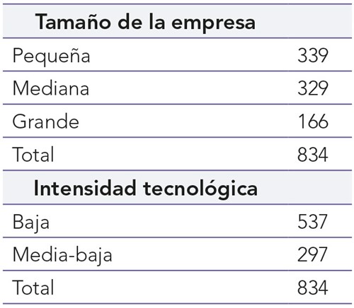 La población objetiva del estudio está conformada por las empresas de manufactura peruanas de baja y media-baja intensidad tecnológica (L&LMT) que no realizaron actividades de Investigación y Desarrollo (I&D) interna y/o externa durante 2014. La unidad de análisis fueron las empresas que participaron en la Encuesta Nacional de Innovación en la Industria Manufacturera 2015. Según reporta el Instituto Nacional de Estadística e Informática, la información ha sido obtenida mediante la entrevista directa, con cada informante asignado por las empresas consideradas en la muestra. La encuesta se desarrolló en las regiones Lima, Arequipa, La Libertad, Áncash, Ica, Piura, Ucayali, Lambayeque, Junín y San Martín. Se ha verificado que, en conjunto, las empresas de estas regiones generan más del 90 % del valor de la producción de la actividad manufacturera a nivel nacional. Este informe de encuesta se llevó a cabo en 2015 y estuvo a cargo del personal de encuestadores capacitados para desarrollar esa labor. La ejecución del trabajo de campo tuvo por resultado 1452 encuestas realizadas que cubren el periodo de tres años consecutivos (desde 2012 hasta 2014); posteriormente, para el análisis, nos centramos en 2014. Se consideran en la muestra de estudio 834 empresas manufactureras, debido a nuestro interés para analizar las innovaciones de productos y procesos.