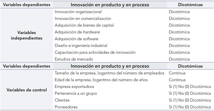 Las variables dependientes son relativas al rendimiento de innovación en un periodo específico. La innovación de productos tuvo lugar cuando la empresa declaró que había introducido productos completamente nuevos o productos con modificaciones importantes. Es una variable dicotómica, tomando el valor 1= cuando se ha producido la innovación del producto; de lo contrario, 0.